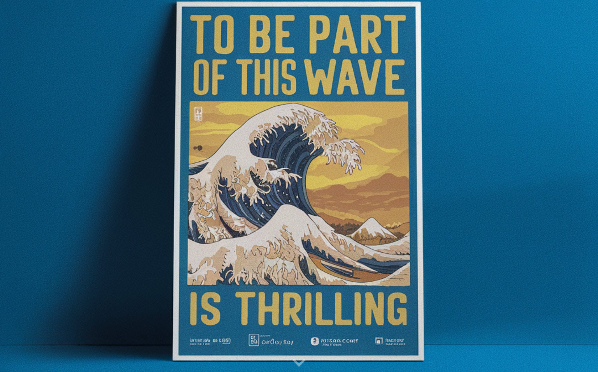 I probably should have used a different wave image, but partly the idea was to look at the original art/image and emphasize the “surfing” part of the tsunami. Maybe one of the great curling waves that surfers like in certain surfing spots.